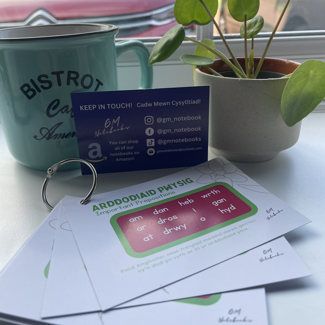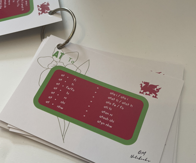 Introducing GM Notebooks' latest product: Arddodiaid Cardiau Fflach — the ultimate tool to help you master Welsh prepositions and their mutations! This set includes 14 high-quality, glossy flashcards, each detailing a different rule to remember when prepositions change. Each card is printed with clear, concise explanations, designed to make learning easier and more effective. The set comes with a durable ring, allowing you to easily flip through the cards and keep them safe and organized wherever you go. Perfect for learners of all levels, this essential study aid is available now for just £4.99.